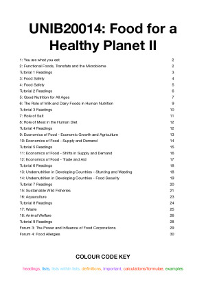 These notes comprehensively and concisely cover content from all lectures in the 12 week course. I have included everything you need to know and nothing you don't. Time has been taken to focus on particularly difficult topics. Notes are brightly colour coded to help with clarity and memory. I have also included summaries of readings where I have emphasised the main points that are important for successfully answering tutorial and exam questions. Additionally, summaries from Forum reports have been included. I used these notes in semester 2 of 2020 to achieve an 87% in the Food for a Healthy Planet II subject. Topics covered include: - basic food chemistry - food safety - nutrition for all ages - salt and meat in the human diet - economics of food - undernutrition - fisheries and aquaculture - waste - animal welfare Readings covered: Bouis & Saltzman (2017), Improving nutrition through biofortification Shrapnel (2012), Should trans fat be regulated? FSANZ (2017) Trans fatty acids Fung, Wang & Menon (2018), Food Safety in the 21st Century Magan (2015), Cracking Down on Food Waste Means Paying Attention to Sell-by Dates The Lancet, Maternal and Child Nutrition EAT-Lancet Commission Summary Report (2019), Healthy Diets from Sustainable Food Systems Kotchen, Cowley and Frohlich (2013), Salt in Health and Disease Reynolds, Wulster-Radcliffe, Aaron and Davis (2015), Importance of Animals in Agricultural Sustainability and Food Security Eady and Hajkowicz (2015), A hungrier, wealthier, choosier, smarter, riskier world: five challenges for Australian Agriculture Hatfield-Dodds and Gooday (2020), Don’t panic: Australia has truly excellent food security FAO Report (2011), Price Volatility in Food and Agricultural Markets: Policy Responses — Measures to increase productivity, sustainability and resilience of agriculture Moir and Morris (2011), Global Trade in Food Lee and Minniecon (2014), Healthy Start: closing the gap on Indigenous childhood obesity CHO of NSW (2018), Aboriginal Kids: a healthy start to life Béné C et al. (2015), Feeding 9 billion people by 2050 - Putting fish back on the menu Australian Government (2017), Working together to reduce food waste in Australia - Fact Sheet Cornish A., Jones B., Grimmer L., & McGreevy P. (2020), Animal Welfare: our good intentions usually fall short. Here are 4 ways to shop responsibly