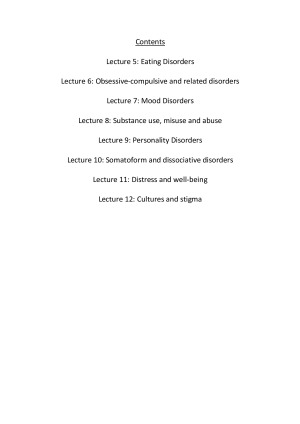 Notes for Psychopathology of Everday Life covering Lecture 5 to 12: Lecture 5: Eating Disorders Lecture 6: Obsessive-compulsive and related disorders Lecture 7: Mood Disorders Lecture 8: Substance use, misuse and abuse Lecture 9: Personality Disorders Lecture 10: Somatoform and dissociative disorders Lecture 11: Distress and well-being Lecture 12: Cultures and stigma