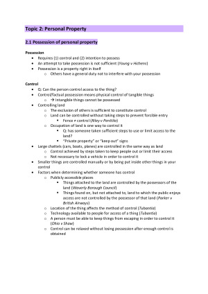 Covers topics 1-5 specifically for the Interim Exam. Notes are comprehensive but concise! Neatly organised for easy reference in an exam scenario. The topics covered in these notes correlate exactly to the 2020 Reading Guide and include: 1. The concept of property 2. Personal property 3. Foundational concepts of land law 4. Adverse possession 5. Native title These notes are NOT within the definition of ‘assessment materials’ according the Melbourne Law School Assessment & Results Policy. They do not contain template style sections nor are they lecture transcripts. Therefore it is not a breach of s 42 of the Academic Board Regulation to purchase these notes.