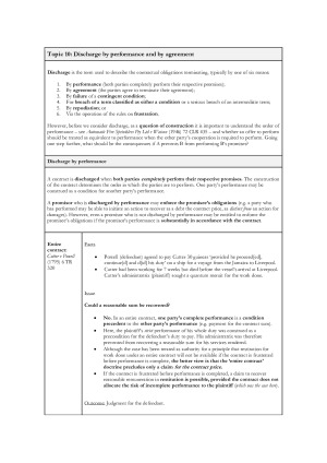 Comprehensive set of LAWS1015 notes prepared in 2020 which are aesthetically presented, providing succinct summaries of all relevant cases and legislation (see topic list below - covers all topics except introduction to contracts which is not examined). Case summaries typically outline the facts, issues, consideration of the issues and outcome. Notes are fully bookmarked and searchable, enabling you to reach the relevant case quickly in the final exam which is now conducted online (in light of COVID-19). Topics covered: 1. Agreement 2. Certainty 3. Consideration 4. Intention to create legal relations and formalities 5. Estoppel 6. Terms 7. Terms 8. Construction 9. Exclusion clauses and privity 10. Discharge by performance and by agreement 11. Discharge for breach and repudiation 12. Process and effect of termination and discharge by frustration
