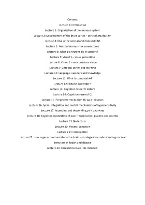 Notes for Complex Functions in Neuroscience Sem 2, 2018, without research lectures, covering: Lecture 1: Introduction Lecture 2: Organization of the nervous system Lecture 3: Development of the brain cortex – cortical arealization Lecture 4: Glia in the normal and diseased CNS Lecture 5: Neuroanatomy – the connectome Lecture 6: What do neurons do in concert? Lecture 7: Visual 1 – visual perception Lecture 8: Vision 2 – subconscious vision Lecture 9: Cerebral cortex and learning Lecture 10: Language, numbers and knowledge Lecture 11: What is computable? Lecture 12: What is knowable? Lecture 13: Cognition research lecture (not included) Lecture 14: Cognition research 2 (not included) Lecture 15: Peripheral mechanism for pain initiation Lecture 16: Spinal integration and central mechanisms of hypersensitivity Lecture 17: Ascending and descending pain pathways Lecture 18: Cognition modulation of pain – expectation, placebo and nocebo Lecture 19: No lecture Lecture 20: Visceral sensation Lecture 21: Interoception Lecture 22: How organs communicate to the brain – strategies for understanding visceral sensation in health and disease Lecture 23: Research lecture (not included)