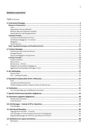 These are exam notes to help you answer hypo and essay questions in Remedies. I focus on making sure they are detailed enough to help you understand the issues and can contrast the legal complexities, but not so long that you cannot keep up with time requirements of the exam. The Notes are structures so they are helpful for during exam reference, or as a learning aid for during semester. ABOUT ME: I have a H1 WAM and am employed by Melb Uni as a qualified law tutor: - I am employed by the University of Melbourne as a Law tutor in the Indigenous Tutorial Assistance Scheme (ITAS) - I was an STS Tutor in Constitutional Law