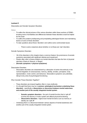 254 pages of comprehensive Lecture Notes/Content Summary for all examinable lectures for PSYC30014: Psychopathology of Everyday Life. To study for the exam I simply went back and studied these notes and I finished the subject with an overall score of 90 (score was scaled down 7 points in our cohort - so raw mark would have been somewhere around 97). Please note that in 2020 the final two lectures were not examinable due to late publishing - so summaries are not included here. Document Includes Lecture 1: Understanding Psychopathology Lecture 2: Anxiety Disorders Lecture 3: Mood Disorders Lecture 4: Eating Disorders Lecture 5: Schizophrenia Spectrum and Other Psychotic Disorders Lecture 6: Dissociative and Somatic Symptom Disorders Lecture 7: Personality Disorders Lecture 8: Trauma And Stressor Related Disorders Lecture 9: Addictive Disorders Lecture 10: Obsessive-Compulsive and Related Disorders Note: 37 pages of this document are not full pages. These are just pages where the lecture has ended and I have begun a new page to start the next lecture or where I have included a small page break for readability. Most of these pages are over 3/4 full.