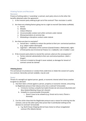 Extremely methodical exam scaffolds for the USYD unit Torts and Contracts II. Breaks down every topic into a step-by-step process. Updated with the latest 2020 law. Please note it is only for the final exam meaning it only contains content from topic 4 (vitiating factors) onwards. You can check out my other listing for more expansive exam notes. Table of Contents: Vitiating Factors and Rescission 2 Rescission 2 Duress 2 Mistake 3 Undue influence 4 Unconscionable conduct 5 Unfair Contracts Under Statute 6 Misrepresentation at common law 7 Statutory Liability for Misleading or Deceptive Conduct – ACL s 18 8 More Torts 10 Trespass to Land 10 Private Nuisance 11 Tortious Interference with Goods Problem 13 Pure Economic Loss 16 Deceit or Fraud (Cf. PEL) 16 Negligent Misstatement 16 Professional Negligence 17 Damage to Third Party Property 18 Third Party Injury 19 Defective Structures 20 Defective Products 21 Proportionate Liability 22