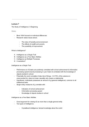 98 pages of comprehensive Lecture Notes/Content Summary for PSYC20008 Developmental Psychology. To study for the exam I simply went back and studied these notes and I finished the subject with an overall score of 87. Please note that in 2019 a handful of lectures were not delivered to us (due to lecturer absence) - so summaries for those lectures are not included here. Document Includes Lecture 2: Theory of Mind Lecture 3: Cognitive Development - A Living Science Lecture 4: Infancy - Basic Processes and Social Responsiveness Lecture 5: Infancy - Core Knowledge Theories Lecture 6: Development of 'Tools' for Thoughts (2-7 Years) Lecture 7: The Study of Intelligence: A Beginning Lecture 9: Language Development Lecture 10: Word Segmentation & Word Learning Lecture 11: Parts of Speech Lecture 12: Social & Emotional Development Lecture 13: Emotional Development Lecture 14: Development of Social Understanding Lecture 15: Development Within The Family Lecture 16: Family Variations (Non-normative) Lecture 17: Development with Peers Lecture 18: An Introduction to Human Genetics Part 1 Note: 26 pages of this document are not full pages. These are just pages where the lecture has ended and I have begun a new page to start the next lecture or where I have included a small page break for readability. Most of these pages are over 3/4 full.