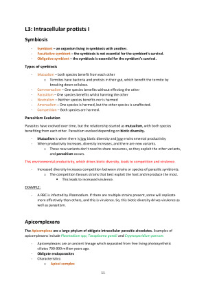 MIIM30017 - Parasitology - Full Lecture Notes (91) Structured with clear headings and colour codings (green - parasite names; orange/blue - important terms/definitions; yellow highlight - important molecules; red - important points addressed in assessments). Topics Covered: L1: Introduction L2: Introduction to Protists L3: Intracellular Protists I L4: Plasmodium II L5: Toxoplasma, Cryptosporidium and other Apicomplexan parasites L6: Cryptosporidium L7: Trypanosomatid Parasites I L8: Trypanosomatid parasites II L9: Microaerophiles L10: Coinfections and malaria L13: Helminths L14: Soil transmitted helminths I L15: Soil transmitted helminths II L17: Soil transmitted helminths III and pinworms L18: Soil transmitted helminths IV – zoonoses L19: Vector and food borne nematodes L20: Foodborne nematodes I L22: Foodborne Trematodiasis II L23: Waterborne Trematodiasis L24: Platyhelminth cestodes – tapeworms L25: Tapeworm parasites II L29: Diseases transmitted by arthropods L30: Ticks and Tick borne diseases L31: Mites L32: Fleas and Flies Note that non-content lectures have been omitted (eg. where an MST falls in a lecture slot).