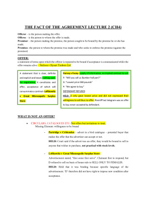 Detailed notes. A combination of lecture notes and the text book Lectures: - Offer and Acceptance - Consideration - Part payment - Estoppel - Req of writing - Intention to create legal relations - Terms - Exclusion clauses - Implied terms - Privaty - Uncertainty and completeness