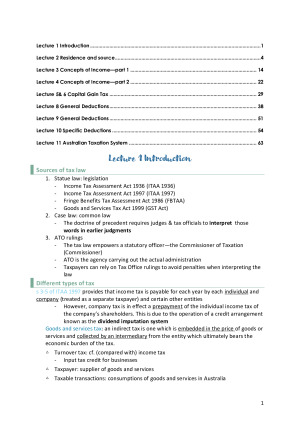 Topics covered: Lecture 1 Introduction Lecture 2 Residence and source Lecture 3&4 Concepts of Income Lecture 5& 6 Capital Gain Tax Lecture 8&9 General Deductions Lecture 10 Specific Deductions Lecture 11 Australian Taxation System Information sourced from textbook, lecture slides, legislation and case materials. You can use this note as the sole material for assignments and exam revision. Good for open book exams. Placed 1st in semester