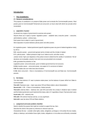 LPAB Australian Constitutional Law Introduction separation of power the history scope of head of power characterisation restrictions Federal powers Separation of powers Executive power of the Commonwealth, Constitution, s 61 Judicial power of the Commonwealth: Constitution, s 71 High Court's appellate jurisdiction: Constitution, s 73 High Court's original jurisdiction: Constitution, s 75(iii) and s 75(v); s 76(i) and s 76(ii) Power to define jurisdiction: Constitution, s 77 "Absolute freedom" of trade, commerce and intercourse: Constitution, s 92 Implied freedom Federalism Commonwealth-State relations