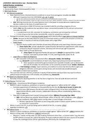 Scaffolds/Summaries used to obtain a 90 in the final exam (problem questions) (88 in the whole course). Clearly structured to assist answering problem questions, including the following topics: - Merits Review - Judicial Review Jurisdiction - Limiting Judicial Review Jurisdiction - Standing - Regulations - Procedural Fairness (Implication, Hearing Rule, Bias Rule) - Considerations Grounds & Unauthorised Purposes - Policies & Representations - Acting under Dictation and Unauthorised Delegation - Unreasonableness and Uncertainty - Errors of Fact and Law - Jurisdictional Errors - Remedies