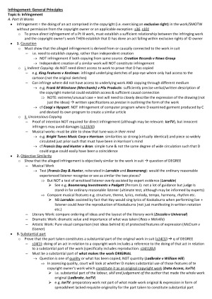 Copyright Scaffolds/Summaries on Infringement of Copyright used to obtain a distinction in the final exam, clearly structured to assist answering a problem question. Includes the following topics: - Infringement (general scaffold: how to answer an infringement question) - Subject Matter - Subsistence - Ownership and Authorship - General Principles re Copyright Infringement (see notes sample) - Exclusive Economic Rights - Authorisation - Exceptions to Infringement - Moral and Other Rights (Note: does not include Design topic)