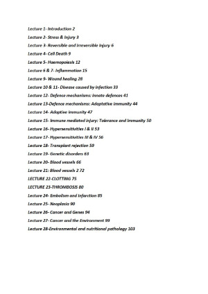 Complete set of H1 lecture notes for PATH20001 semester 2, 2020 with topics covering - -Stress and injury -Cell death -Haemopoesis -Wound healing -Disease causes by infection -Defence mechanisms (innate and adaptive) -Immune mediated injuries -Hypersensitivities -Transplant rejection -Genetic disorders -Blood vessels -Clotting and thrombosis -Embolism and infarctions -Neoplasia -Cancer and genes/ environment -Environmental and nutritional pathology