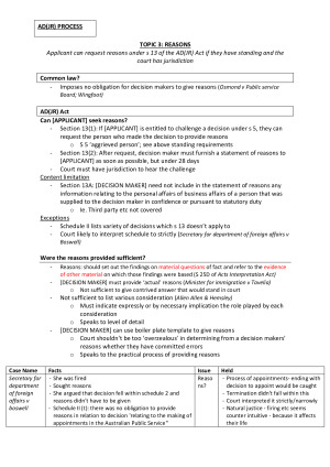 SUMMARY - Concise admin law notes, suitable for JD or LLB - Case summaries included at the end of each topic - where applicable, steps and sentences to guide exam answers TOPICS COVERED! (12 weeks of content) AD(JR) Act 1- Jurisdiction (page 3) 2- Standing (page 4) 3- Reasons (page 8) 4- Grounds of review – Ultra vires (page 9) a. Absence of power i. Actions not permitted by statute (page 9) ii. Improper delegation: action by wrong person/body (page 9) iii. Disregard for procedural requirements (page 10) b. Abuse of power or discretion i. Relevant and irrelevant considerations (page 10) ii. Bad faith and improper purpose (page 10) iii. Unreasonableness (page 11) c. Fact finding errors i. No evidence (page 12) ii. Jurisdictional fact concept (page 12) d. Failure to exercise discretion i. Inflexible policy application (page 13) ii. Acting under dictation (page 13) 5- Grounds of review – Procedural fairness (page 20) a. Hearing rule (page 20) b. Bias rule (page 22) 6- Remedies (page 34) AAT 1- Jurisdiction (page 35) 2- Standing (page 35) 3- Role of AAT (page 35-36) 4- Remedies (page 36) Common law 1- Jurisdiction (page 39) 2- Standing (page 42) 3- Grounds of review (See box in top left ADJR grounds to see if applicable to CL) 4- Remedies (page 46) Privative clauses and jurisdictional error (page 29)