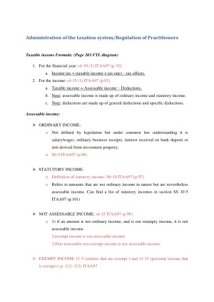 Comprehensive notes on major examinable aspects of LAWS2206 Taxation Law. The notes integrate theory, diagrams and legal case precedence to create a thorough notes package.