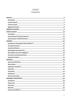 Full summary of all content covered in LAWS1022, including all cases and textbook readings Colour coded - (yellow = cases, green = legislation) All policy readings have been summarised Topics: - Assault: Common assault, consent to harm, aggravated assaults, sexual assault - Domestic violence - Murder: Constructive murder, unlawful act, criminal negligence, homicide by omission, homicide in context - Defences: Mental illness, substantial impairment, infanticide, intoxication, self-defence, extreme provocation - Dishonest acquisition - Extending criminal liability: complicity, accessorial liability, conspiracy