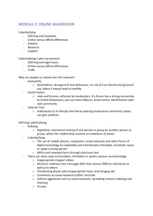 These are my subject notes which cover each lecture topic presented throughout the semester in detail. These include: - Module 1: Introduction to unit and cyberpsychology - Module 2: Online aggression - Module 3: Online therapy and support - Module 4: Videogames for training skills and changing behaviour - Module 5: Online environments - Module 6: Online relationships - Module 7: Online learning, working and motivation - Module 8: Online addictions - Module 9: Online communities - Module 10: Online protest - Module 12: Conspiracy theories - Module 13: Illicit activities - Module 14: Online racism and prejudice Each lecture module has been broken down into comprehensible dot points which makes the content easier to understand and build upon. Please note that these notes do not contain any exam/assignment information, such as quizzes, practice questions, hints, ect. They are purely lecture summaries.