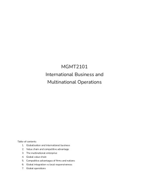 Topics covered: - globalisation and international business - value chain and competitive advantage - the multinational enterprise - global value chain - competitive advantages of firms and nations - global integration vs local responsiveness - global operations