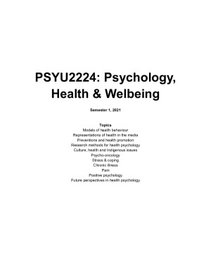 Lecture notes from all weeks Topics included Models of health behaviour Representations of health in the media Preventions and health promotion Research methods for health psychology Culture, health and Indigenous issues Psycho-oncology Stress & coping Chronic illness Pain Positive psychology Future perspectives in health psychology