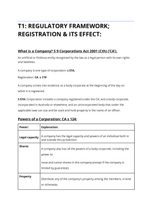 These notes provide a detailed summary of the course including case summary and steps to follow in applying these topics (eg. issue, rule, application, conclusion). I also have checklists for the exam available to purchase which go hand in hand with these notes. The checklists are 1-2 page step by step outlines for each topic. TOPICS: - Regulatory Framework; Registration & its effect. - Types of Companies, Business form, constitution & Replaceable Rules. - The companies relationship with outsiders. - Promoters. - Pre-Registration Contracts. - Fundraising. - Share Capital. - Membership. - Dividends. - Directors Duties Part 1 and 2. - Directors Duties Consequences. - Members Meetings & Minority Protection. - Financial Auditing. - Corporate Insolvency.