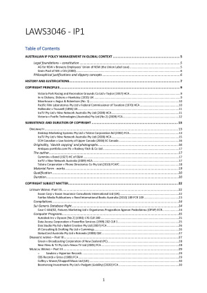 I used these notes to achieve a final mark of 80 in IP1 during T1 2021. They contain full notes on all required readings (including all readings which will be required from the new edition of the textbook). Specifically these notes contain summaries for all cases needed to answer the final problem question and will assist with ongoing CP. Topics covered: - Australian IP Policy Management in the Global Context - History and Justifications - General Copyright Principles - Subsistence and Duration of Copyright (including originality, subsistence, material form requirements, etc.) - Copyright subject matter (including Literary works, Dramatic works, Musical works, Artistic works, Sound recordings, Cinematograph films) - Ownership of Copyright - Exploitation of Copyright - Infringement - Exclusive rights - Exceptions to infringement (including Fair dealing) PLUS Asynchronous content - Other rights (including moral rights) - Design rights (including copyright/design overlap provisions)