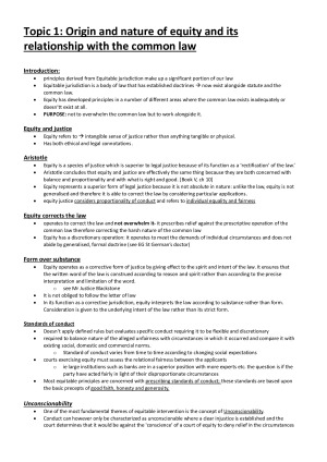 These MLL405 notes encompass all you need for Equity and Trusts, with enough detail to allow you to understand the whole unit without any unnecessary text to waste your time. Includes case summaries and relevant legislation (broken down into simple English) in a very organised layout. Topics: 1. Origin and nature of equity and its relationship with the common law 2. Undue Influence (UI) and Unconscientiously Dealing (UD) 3. Fiduciary relationships 4. Fiduciary remedies 5. Equitable remedies: specific performance and injunctions 6. Trusts: Nature and Creation 7. Trustee duties 8. Beneficiary and trustee rights and powers 9. Statutory Formalities 10. Charitable trusts