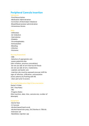 WEEKS 1 - 6 Skills: Peripheral Cannula Insertion CVC site dressing CVC Removal Tracheostomy Suctioning Tracheostomy Dressing Change Manual Bladder Washout Thoracic Drain Removal Assessment of Thoracic Drain Tube and Respiratory Assessment Notes for each skill - Indications Risks Nursing Assessment Nursing/Collaborative Mgt & Documentation Equipment