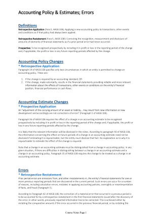 Simple, clean, 19 page Financial Accounting 'Distinction' course notes, provided alongside AASB references for further detail. Notes have been created using the textbook, course readings, accounting standards, lectures, and tutorials. Topics include: - Accounting Policy & Estimates; Errors. - Adjusting & Non-Adjusting Events. - Leases. - Provisions & Contingent Liabilities. - Plant & Equipment. - Intangibles. - Impairment. - Cash Flow Statements.