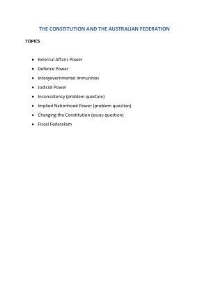 These are extensive and comprehensive exam notes for LLAW2212 The Constitution and the Australian Federation. I note that although the curriculum at Flinders has now changed, this topic covered a substantial amount of the content in the new Constitutional Law topic and therefore would still be very helpful in combination with the notes from LLAW2221 - The Constitution and the Australian People. Areas covered: • External Affairs Power • Defence Power • Intergovernmental Immunities • Judicial Power • Inconsistency (problem question) • Implied Nationhood Power (problem question) • Changing the Constitution (essay question) • Fiscal Federalism These notes are colour-coded and have a cohesive flow. They break down the topics and are structured in a way to enable you to tackle any exam question on that topic. It includes case summaries and many different examples. It also provides some prompts that may assist you in applying the legal principles to the facts before you. I achieved a HD for this exam and can attribute the grade to these notes. It is recommended that you use these notes as the basis for your own exam notes.