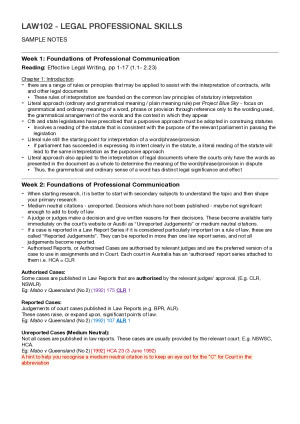 Topic 1: Foundations of Professional Communication Topic 2: Effective Legal Research Skills (Featuring Skills Relevant to Sourcing/ Understanding Statute and Case Law) Topic 3 : Working with Facts and Precedent Topic 4: Constructing the Legal Research Essay Topic 5: NO NOTES PROVIDED Topic 6: Effective Legal Problem Solving Skills (Featuring Statutory Interpretation) Topic 7: Communication Skills for Professional Legal Practice Part 1 Topic 8: Communication Skills for Professional Legal Practice Part 2 Topic 9: Professionalism & Courtesy in Legal Practice Topic 10: Giving Voice to Values in Legal Practice