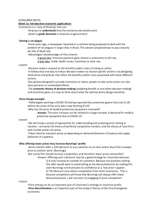 These notes cover all the content for all weeks of ECON10001: (Week 1 - 11) - Separated into weekly sections and topic sub-sections for easier access - Each week also has all readings integrated into them - Contains accompanying pictures and diagrams for easier understanding of the content (especially construction material and equipment) - Annotated with accompanying text boxes to add extra depth and understanding to particularly subtle/hard content Main Topics: Week 1 A: Introductory Case Studies B: Introduction to key concepts in microeconomics Week 2 A: Demand and supply B: Market equilibrium and comparative statics Week 3 A: What determines price and quantity? – 1. Elasticity and applications B: What determines price and quantity? – 2. Government intervention Week 4 A: Welfare in perfectly competitive markets B: International trade Week 5 A: Market failure 1: Externalities B: Market failure 2: Public goods Week 6 A: Key decisions and key concepts B: Measures of cost Week 7 A: Strategies to reduce costs/Introduction to revenue B: The ‘basic’ price/quantity decision Week 8 A: The effect of competition – Perfectly competitive markets B: The effect of competition – Monopolistic competition and Monopoly/Government regulation Week 9 A: What price to set? B: Selling with an information advantage Week 10 A: Introduction to game theory B: Simultaneous games Week 11 A: Sequential games B: Application to oligopoly