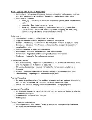 Topics covered: - Introduction to Accounting - Ethics - Financial accounting for business (Double-entry accounting) - Financial Accounting for business (Preparing general journals) - Financing accounting for business (Posting and trial balance) - Financial accounting for business (Adjusting entries & trial balance) - Financial accounting for business (Closing entries) - Financial accounting for business (Preparing financial statements) - Financial accounting for business (Interpreting financial statements) - Management accounting - Management accounting (Cost volume profit analysis) - Sustainability