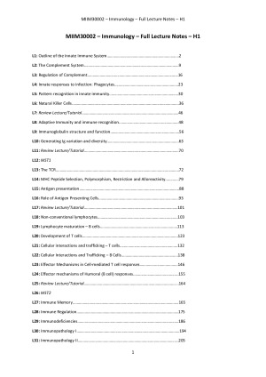 MIIM30002 - Principles of Immunology - Full Lecture Notes - H1 Includes full notes on all lectures and review lectures/tutorials. L1: Outline of the Innate Immune System L2: The Complement System L3: Regulation of Complement L4: Innate responses to infection: Phagocytes L5: Pattern recognition in innate immunity L6: Natural Killer Cells L7: Review Lecture/Tutorial L8: Adaptive Immunity and immune recognition L9: Immunoglobulin structure and function L10: Generating Ig variation and diversity L11: Review Lecture/Tutorial L12: MST1 L13: The TCR L14: MHC Peptide Selection, Polymorphism, Restriction and Alloreactivity L15: Antigen presentation L16: Role of Antigen Presenting Cells L17: Review Lecture/Tutorial L18: Non-conventional lymphocytes L19: Lymphocyte maturation – B cells L20: Development of T cells L21: Cellular interactions and trafficking – T Cells L22: Cellular Interactions and Trafficking – B Cells L23: Effector Mechanisms in Cell-mediated T cell responses L24: Effector mechanisms of Humoral (B cell) responses L25: Review Lecture/Tutorial L26: MST2 L27: Immune Memory L28: Immune Regulation L29: Immunodeficiencies L30: Immunopathology I L31: Immunopathology II Structured with clear headings and colour coding (orange - important terms/definitions; yellow and blue highlight - important molecules; red - important points addressed in assessments).