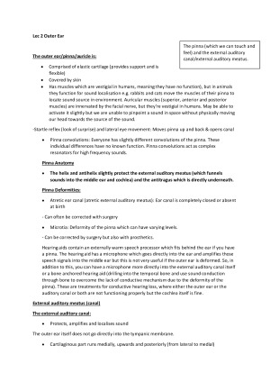 These lecture notes are my blood, sweat and tears (if you know, you know ;) ) They are extremely detailed and comprehensive and includes everything covered in the exams and MSTs. All topics included: -Outer ear, middle ear and inner ear anatomy and physiology - Vestibular anatomy and physiology - Cochlear nucleus, auditory brainstem, auditory cortex -Larynx, voice, speech production -Evolution of speech and hearing -Cochlear implants and pathophysiology -Paediatric cochlear implantation -Development of inner ear -Stem cell therapies in auditory neuroscience -Bioengineering in auditory neuroscience They are organized under subheadings which highlight key focus points and essential knowledge required for you to score highly in this subject. Notes are very comprehensive (not just copy-pasted dot points) with detailed explanations to assist your understanding. They have been immensely helpful to me this semester and using them as a basis for forming or consolidating your own notes would save a load of time. I hope they will prove to be great studying material for you! Good luck!