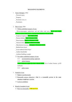 The note covers a wide range of topics in the unit including: 1. Negligence elements (type of damages; duty of care; standard of care; breach of standard of care; causation; defences). 2. Vicarious liability and Non-delegable duties. 3. Damages for personal injury (with the focus on compensatory damages). 4. Trespass to the person. 5. Trespass to land. 6. Private nuisance (by interference with use and enjoyment of property rights). 7. Defamation (with a focus on social media). Relevant legislations and commentaries are provided for each topic. This note is suitable for both assignment and final exam.