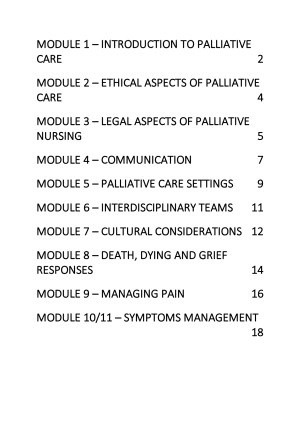 MODULE 1 – INTRODUCTION TO PALLIATIVE MODULE 2 – ETHICAL ASPECTS OF PALLIATIVE MODULE 3 – LEGAL ASPECTS OF PALLIATIVE MODULE 4 – COMMUNICATION MODULE 5 – PALLIATIVE CARE SETTINGS MODULE 6 – INTERDISCIPLINARY TEAMS MODULE 7 – CULTURAL CONSIDERATIONS MODULE 8 – DEATH, DYING AND GRIEF RESPONSES MODULE 9 – MANAGING PAIN MODULE 10/11 – SYMPTOMS MANAGEMENT