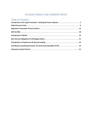 These finance law notes summarise each week's topics along with relevant cases, tables, and diagrams to assist your understanding. These notes will be highly useful to refer back to when completing the weekly questions as well as revising for the final exam, as they were for me in gaining a HD mark! Topics include: -Introduction to the Legal Framework: Banking & Finance Industry -Global Financial Crisis -Regulatory Framework: Financial Advice -ASIC & APRA -Introduction to NCCPA -Best Interests Obligations for Mortgage Brokers -Introduction to Property Law & Secured Lending -Anti-Money Laundering & Counter Terrorism Financing (AML & CTF) -ePayments Code & FinTech