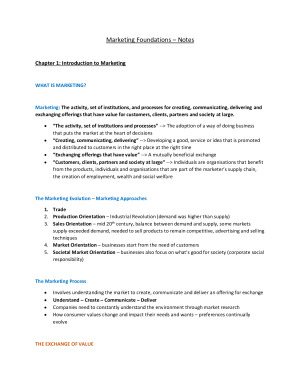 Full semester of subject notes. Topics: INTRODUCTION TO MARKETING - What is marketing? - The exchange of value - Ethics, corporate social responsibility and sustainable marketing - The marketing mix THE MARKETING ENVIRONMENT AND MARKET ANALYSIS - The marketing environment - Internal environment - Micro environment - Macro environment - Situation analysis and marketing planning MARKET RESEARCH - The role of market research in marketing decisions - Defining a market research problem - Key research design issues - Data collection, analysis and reporting CONSUMER BEHAVIOUR - What is consumer behaviour? - Group factors - Individual factors - Consumer involvement and the decision-making process MARKETS: SEGMENTATION< TARGETING AND POSITIONING - Knowing the market - Target marketing - Market segmentation - Market targeting - Positioning PRODUCT - Products: goods, services and ideas - Product life cycle - Product differentiation - Branding - Packaging - Managing products PRICE - Pricing objectives - Demand Considerations - Cost and revenue analysis - Competition considerations - Pricing for intermediaries - Price management THE LAW OF MARKETING - The law and marketing - Market games and competitions - Product packaging and labelling PROMOTION - What is promotion? - Integrated marketing communications - Advertising - Public relations - Sales promotion - Personal selling - Additional forms of promotion ADVERTISING LAW - Advertising - Advertising self-regulation - Statutory regulation of advertising DISTRIBUTION (PLACE) - Distribution channels - Distribution of goods - Distribution of services - Retailing - Agents and brokers - Wholesaling SERVICES MARKETING - Service-dominant economies - The services marketing mix - Services marketing challenges SOCIAL MARKETING AND NOT-FOR-PROFIT MARKETING - What is social marketing? - Benchmark criteria for social marketing - Three social marketing streams - What is and is not social marketing? - Not-for-profit marketing DIGITAL MARKETING - Digital marketing - Characteristics of digital marketing - Digital marketing methods - Ethical and legal issues - Digital marketing and marketing strategy INTERNATIONAL MARKETING - International marketing fundamentals - The international marketing environment - Why and how organisations go international - The international marketing mix E-COMMERCE - E-commerce and contract law - E-commerce and intellectual property law - Spam - Electronic banking - E-commerce and crime DATA AND ANALYTICS - Data-driven marketing - Big data - Data analytics in marketing - Issues in analytics BUSINESS BUYING BEHAVIOUR - Business markets - Marketing to business customers - Characteristics of business demand - Business buying behaviour