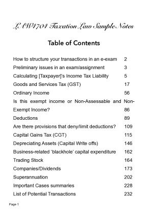 These complete notes which contain all legislation and relevant cases were used in my exam and allowed me to score a HD (83). I scored 30/40 for the assignment ( the highest scorer was 34/40) meaning I scored 53/60 (88%) on the exam, all the more impressive given I did not complete the exam. These notes are formatted through headings and sub headings that make the notes very easy to follow and understand for an exam situation. I utilise model responses with fill in the blanks as well as sample responses (for effective case analogising). All lectures and relevant textbook chapters from Stephen Barkoczy’s Foundations of Taxation Law are covered. I have structured these notes as follows: How to structure your transactions in an e-exam 2 Preliminary issues in an exam/assignment 3 Calculating [Taxpayer]’s Income Tax Liability 5 Goods and Services Tax (GST) 17 Ordinary Income 56 Exempt income or Non-Assessable and Non-Exempt Income 86 Deductions 89 Provisions that deny/limit deductions 109 Capital Gains Tax (CGT) 115 Depreciating Assets (Capital Write Offs) 146 Business-related ‘blackhole’ capital expenditure 162 Trading Stock 165 Companies/Dividends 173 Superannuation 202 Important Cases summaries 228 List of Potential Transactions 232 The preliminary parts of the notes will guide you to structuring answers effectively (page 1-4). Commonly, as suggested by the lecturer, the exam scenario is made reminiscent to 8 key cases. Therefore, I included summaries of these cases in my notes (see page 228). Finally, after having developed a strong understanding of taxation law, I created 18 model/scripted responses for very difficult and common transactions that arise (pages 232-261). These model/scripted responses demonstrate how to write effectively and concisely in an exam. NB: Changes to tax rates can occur but these notes are formatted that numbers can be supplemented easily if need be.