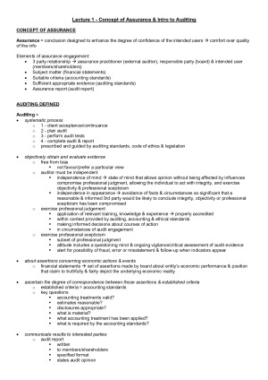 Full summarised notes for the complete Auditing course - covering lectures, textbook readings, other readings and tutorials. I finished this subject in Semester 1, 2020 with a 90 HD Grade. TOPICS: - Lecture 1: Concept of Assurance & Intro to Auditing - Lecture 2: Subject of the Audit - Lectures 3 & 4: Fundamental Audit Concepts - Lecture 5: Data in the Audit - Lecture 6: Client Acceptance & Continuance, Initial Audit Planning, Understanding the Client & Environment in which it operates - Lecture 7: Inherent Risk & Control Risk - Lecture 8: Tests of Controls - Lecture 9: Substantive Testing - Lecture 10: Completion & Review