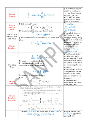 These notes thoroughly cover all lecture content for the entire course - for the final exam. Notes include but are not limited to the following topics: - real - complex numbers - integration - taylor's series - power series - convergence - arguments - euler's formula - De Moivre's - natural logarithm - limits - derivatives - Cauchy-Riemann - laplace's - harmonic conjugates - contour integration - Cauchy's theorem - Green's theorem - Fubini's theorem - residues