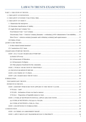 I used these notes to achieve a grade of 85 in Trusts in Semester 1 2020. These notes are clear and concise yet comprehensive, and embed short case summaries throughout. These notes are extremely well structured, providing an easy to follow script to use in the exam. Topics are organised in way that is most useful for achieving a HD in the unit. Topics are set out as follows: PART 1: CREATION OF TRUSTS - Certainty of Intention - Certainty of Subject Matter - Certainty of Object - Quistclose Trusts - Charitable Purpose Trusts - Formalities - Constitution PART 2: TRUSTEES' DUTIES A: Custodial Duties B: Fiduciary Duties C: General Trust Management Duties D: Investment Duties E: Defences PART 3: RIGHTS A: Rights of Trustees B: Rights of Beneficiaries C: Remedies