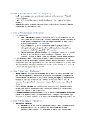 I am a computer science and neuroscience major in a Bachelor of IT/Bachelor of Science (Advanced) course at the University of Sydney. These summary notes enabled me to achieve a score of 89 in COMP5349 Cloud Computing. They cover topics of: Introduction To Cloud Computing (Lecture 1), Virtualisation Technology (Lecture 2), Container Technology (Lecture 3), MapReduce Framework (Lecture 4), Spark Framework (Lecture 5), Combiner in Spark RDD/GFS + YARN (Lecture 6 & 7), Spark Data Frame and Execution Plan (Lecture 8), Spark Machine Learning (Lecture 9), Cloud Storage and Database Service (Lecture 10), Paxos (Lecture 11) and Distributed System Management and Kubernetes (Lecture 12).