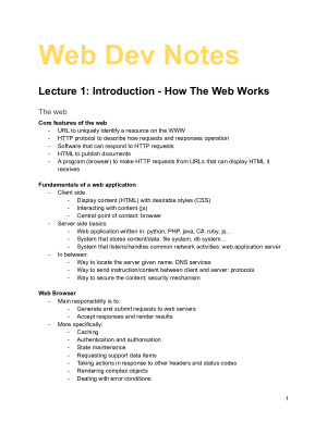 I am a computer science and neuroscience major in a Bachelor of IT/Bachelor of Science (Advanced) course at the University of Sydney. These notes enabled me to achieve a score of 89 (High Distinction) in the subject COMP5347 Web Application Development. They cover topics of: Introduction - How The Web Works (Lecture 1), Introduction to HTML and CSS (Lecture 2), HTML and Client Side Javascript (Lecture 3), The Browser & The Rendering Process (Lecture 4), Server-side Development, (Lecture 5), MVC Architecture, Introduction to MongoDB (Lecture 6), Connecting to MongoDB (Lecture 7), Client Side Libraries (Lecture 8), Web Services (Lecture 10) and Web Application Security (Lecture 12).