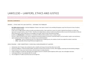 Structure: - Summary of all readings covered in the course supplemented with class notes and discussion - Colour-coded (cases = yellow, legislation = green) - Includes diagrams of key concepts - Cases in table form (facts/issue/holding/reasoning) - All sources of law relevant to the ethical issues covered in the course are presented in table format Topics: - Legal ethics and the law - Behavioural legal ethics - CLCs, clients and communication - Legal profession and entry into the profession - Lawyers' accountability - Fidelity to the law and accountability - Access to justice and the context of change - Ethics of the lawyer-client relationship - Representing and advising the client - Money matters - Ethics implementation - GVV - Client loyalty and trust - Civility, Courtesy and ethics implementation - Conflicting loyalties - Negotiation and ADR - Criminal and family ethics - Corporate ethics - Accountability (competence and care) - Accountability (Civil Litigation) - Future of legal ethics