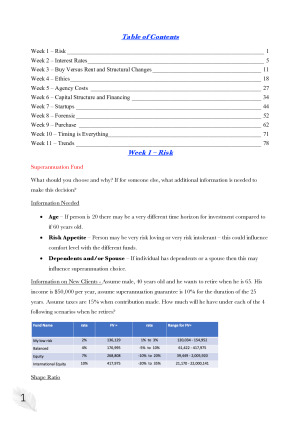 These are well-condensed but detailed notes on each topic to help prepare for final exams and complement your study for Applied Financial Decision Making Capstone at University of Technology Sydney. The following notes contain diagrams and information to help clearly understand Applied Financial Decision Making Capstone 25410 and includes notes from all lectures, tutorials and THE TEXTBOOK. Specifically, the following topics are covered: Week 1 – Risk Week 2 – Interest Rates Week 3 – Buy Versus Rent and Structural Changes Week 4 – Ethics Week 5 – Agency Costs Week 6 – Capital Structure and Financing Week 7 – Startups Week 8 – Forensic Week 9 – Purchase Week 10 – Timing is Everything Week 11 – Trends Note: The sample notes contain approximately 10% of the complete notes.