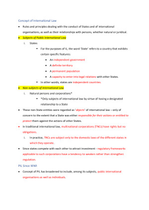 Distinction level notes for 'Public International Law' unit. Summarises the following modules for key exam study: - History of the UN - Differences between Public and Domestic Law - Sources of International Law - Customary International Law - International Law in Australia - Law of the Sea