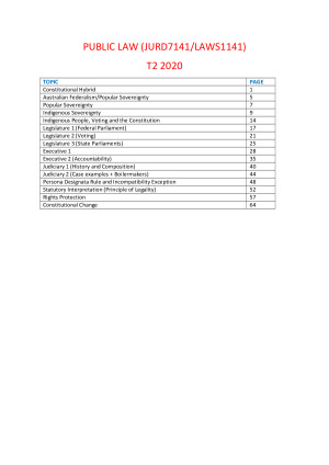 Full notes organised according to reading topics as listed below. Includes case summaries and key principles. This set of notes will serve as a useful study guide to help improve your understanding of the content. Constitutional Hybrid Australian Federalism/Popular Sovereignty Popular Sovereignty Indigenous Sovereignty Indigenous People, Voting and the Constitution Legislature 1 (Federal Parliament) Legislature 2 (Voting) Legislature 3 (State Parliaments) Executive 1 Executive 2 (Accountability) Judiciary 1 (History and Composition) Judiciary 2 (Case examples + Boilermakers) Persona Designata Rule and Incompatibility Exception Statutory Interpretation (Principle of Legality) Rights Protection Constitutional Change