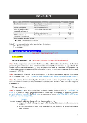 I completed the unit in S1 2021 and relied heavily on this script for the exam. Each topic is scripted by the Act which applies (SDA or DDA) and the form of discrimination (indirect or direct) so all you need to do is select which one is relevant to your question and apply it. This also means you do not need to frantically scroll during an exam as each topic and its elements is repeated for every avenue of discrimination. Topic 1 - Types of discrimination recognised by Australian law Topic 2 - The Legal Basis of Anti-Discrimination Law Topic 3 - The Sex Discrimination Act 1984 (Cth) [including sexual harassment] Topic 4 - The Disability Discrimination Act 1992 (Cth) Alternative arguments, key case principles and 'proportionality/base group' skeletons for reasonable adjustments are also comprehensively considered and scripted.