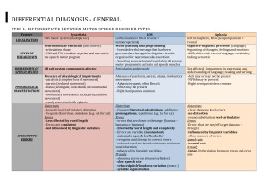 Speech Disorders Across the Lifespan: Summary tables for the types of motor speech disorders, assessments and interventions that were introduced in lectures and readings. Headings - Differential Diagnosis - General - Localisation - Speech Observations: MAYO Clinic classification - Oral Motor Examination Observations - Assessments - Treatment - Principles of Motor Learning - ICF for Motor Speech Dysorder