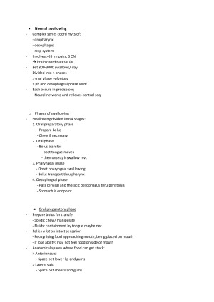 Reflects integration of lecture slides, in-class notes and relevant textbook content. Studied using these notes alone and received HD for this UOS (mark=91). Includes the following topic areas for both dysphagia and motor speech: - Anatomy and Physiology of Normal Swallowing in Adults and Infants - Information Gathering & Interpreting Oral-Motor Assessment - Clinical Bedside Assessment and Modified Barium Swallow - Flexible Endoscopic Evaluation of Swallowing & Principles of Therapy - Dysphagia Management- Compensation and Diet Modification - Dysphagia Management- Rehabilitation - Paediatric Feeding and Swallowing Disorders: Assessment and Treatment - Introduction and Concepts in Motor Speech Control - Dysarthria and Apraxia of Speech - Administering Motor Speech Disorder Assessment - Motor Speech Disorders and Treatment